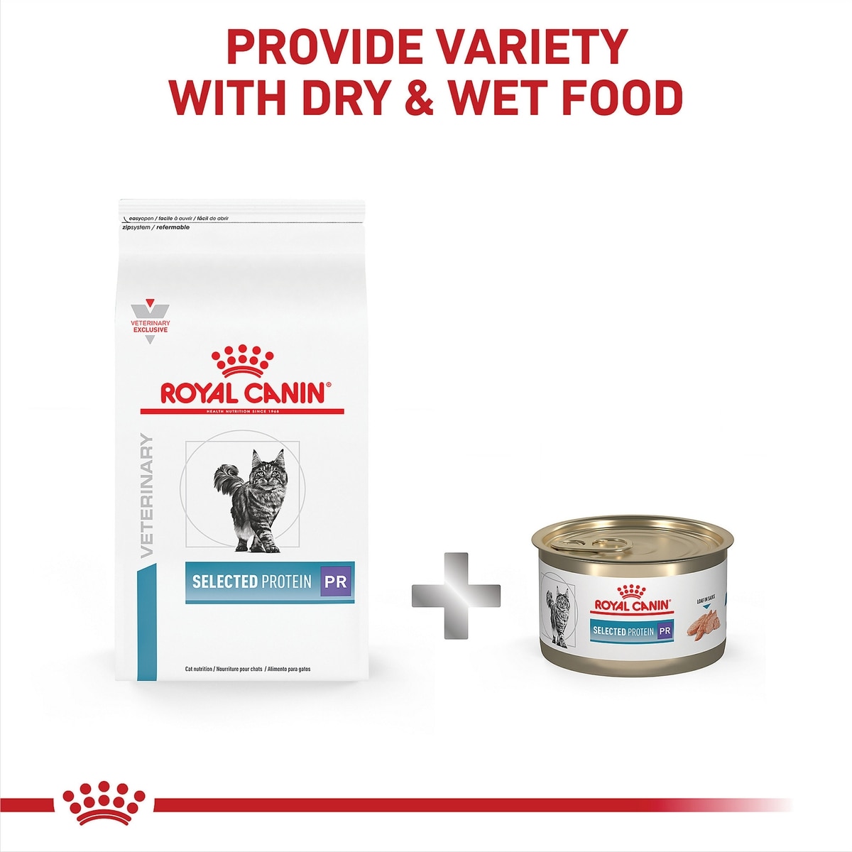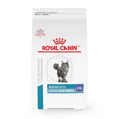 • Royal Canin Veterinary Diet Selected Protein PR Dry Cat Food is a specialized diet made with peas, rabbit, and hydrolyzed soy for cats with food sensitivities.