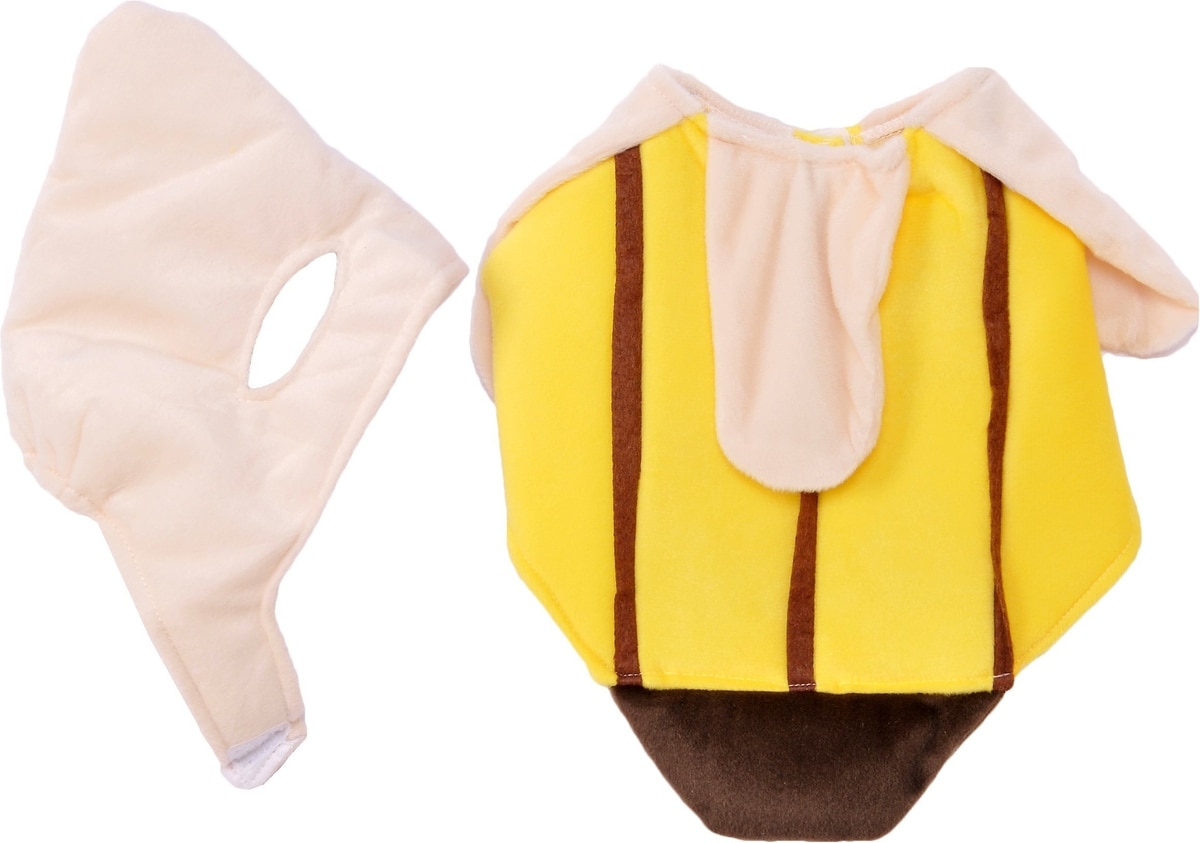 - Two-piece outfit features a bright yellow banana peel body suit with a poly-filled headpiece that looks like the inside of a banana.