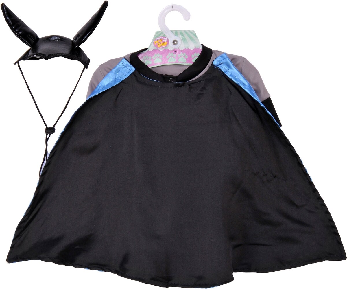 - A double-lined black-and-blue cape and faux-leather headpiece with large bat ears complete the design.