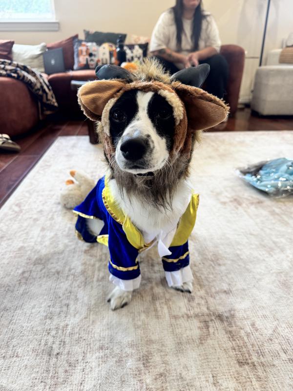- This officially licensed Beauty and the Beast pet costume features Beast’s iconic jacket and tie complete with a matching horned headpiece.
