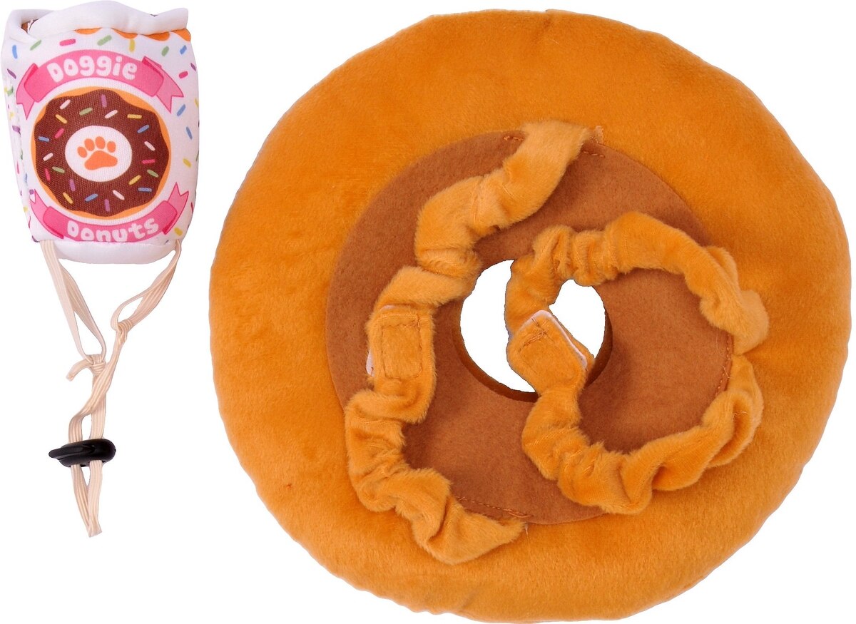 - Two-piece costume features a giant iced doughnut with sprinkles and a cute poly-filled ‘Doggie Donuts’ coffee cup headpiece.