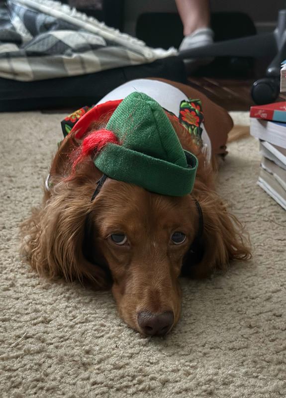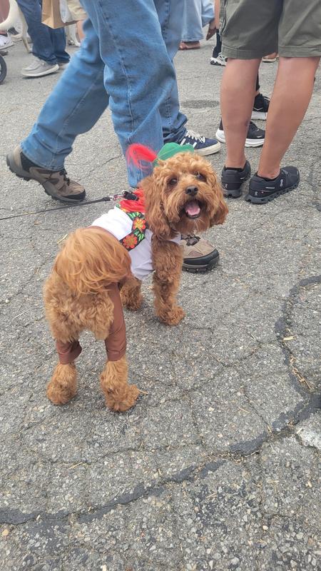 I always by scout a size large but this is a titch big on him. He’s 12 1/2 years old so that might have something to do with it. I think I can fix it so it fits him better. We belong to a Garden Club and we are volunteering at Octoberfest this year and thought Scout should play the part. Everyone will get a kick out of him all dressed up.