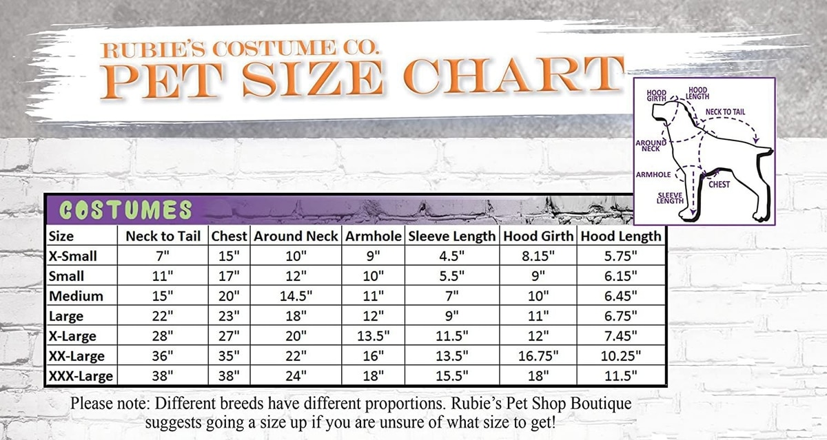 NOTE: Different breeds have different proportions. Rubies Pets suggests going up a size if you are unsure what will fit your pet!
