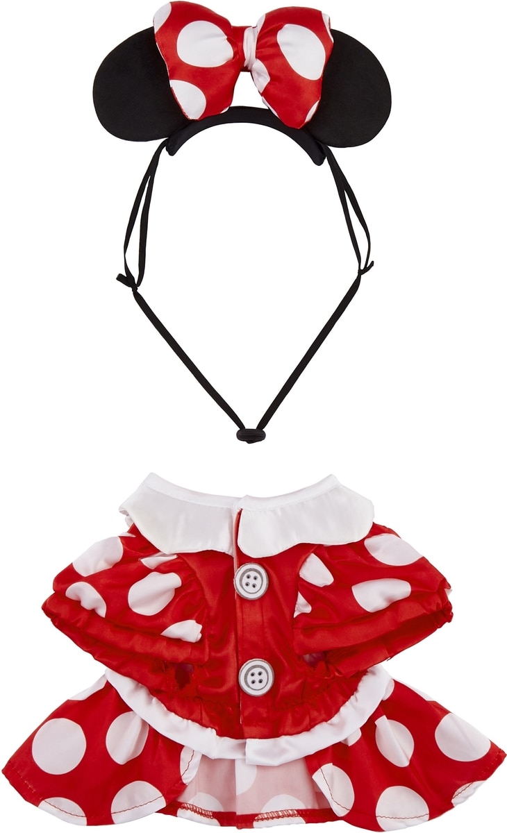 - This officially licensed Disney pet costume features Minnie Mouse’s iconic polka-dot dress complete with ears and a matching bow headpiece.