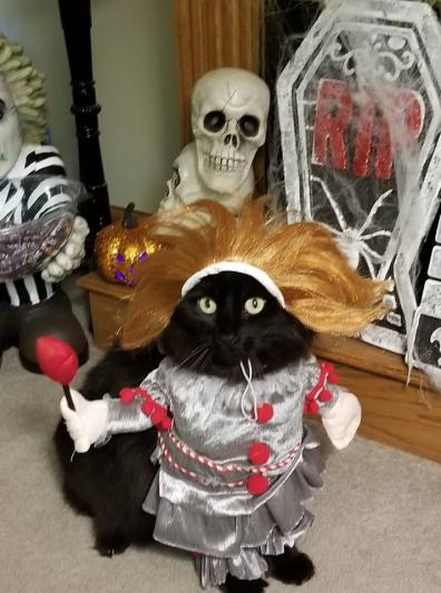 When I put on the costume I screamed because I thought the real pennywise was in my house!! Just kidding I couldn’t stop laughing at how goofy he looks. The wig looks like something my mom would wear but I digress. Any way 10/10 I love torturing my dog <3