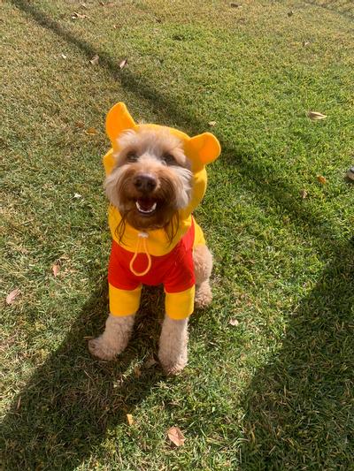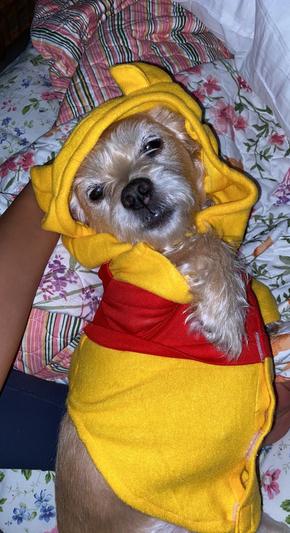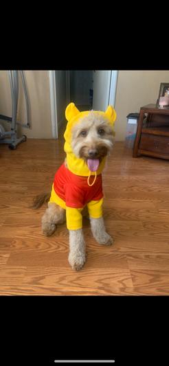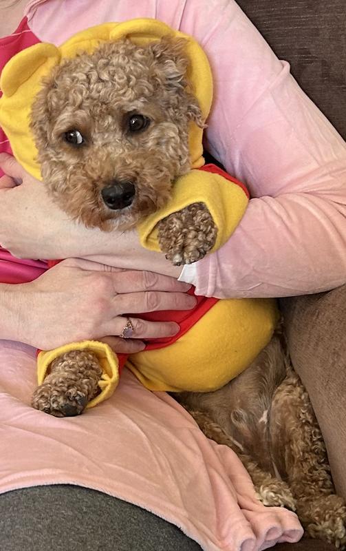 The cutest costume ever! It fit my dog perfectly, runs true to size. I’ll be having the cutest little Winnie the Pooh and Eeyore this Halloween.