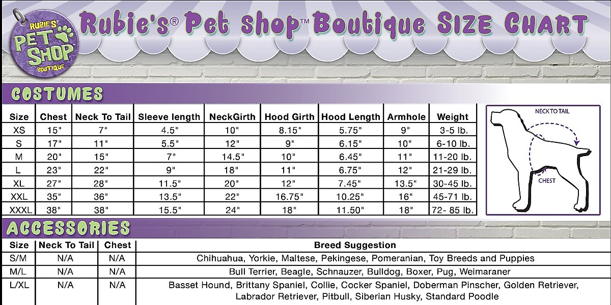 NOTE: Different breeds have different proportions. Rubies Pets suggests going up a size if you are unsure what will fit your pet!