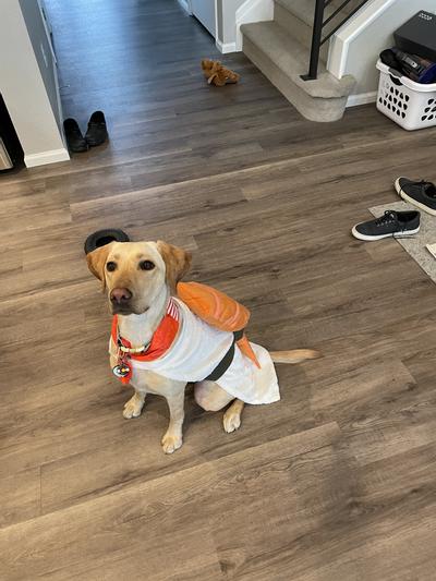 I love the idea of the sushi costume, but this one is poorly made. The fish portion flops off the side and pulls the entire costume to one side because it’s not secured properly to the rest of the costume. As soon as my pup moves the entire costume flops to one side and looks ridiculous.