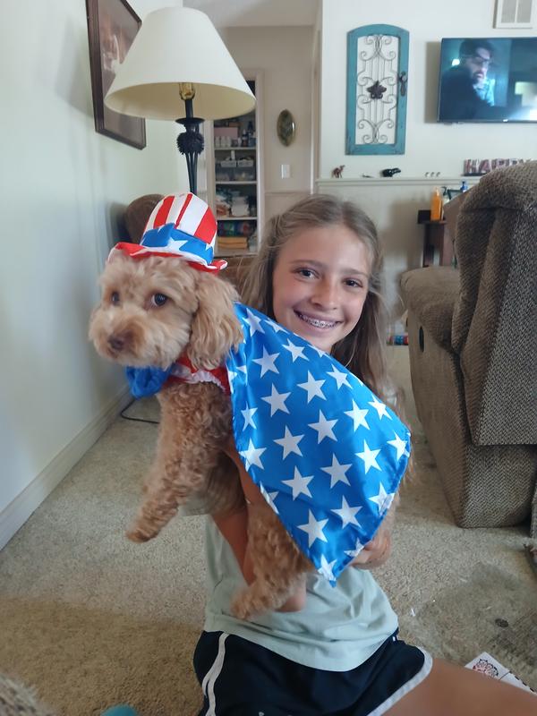 Missy loved her American flag costume to help her celebrate the 4th of July and she loved the attention it got her. The hat didn't stay on much as she played with it