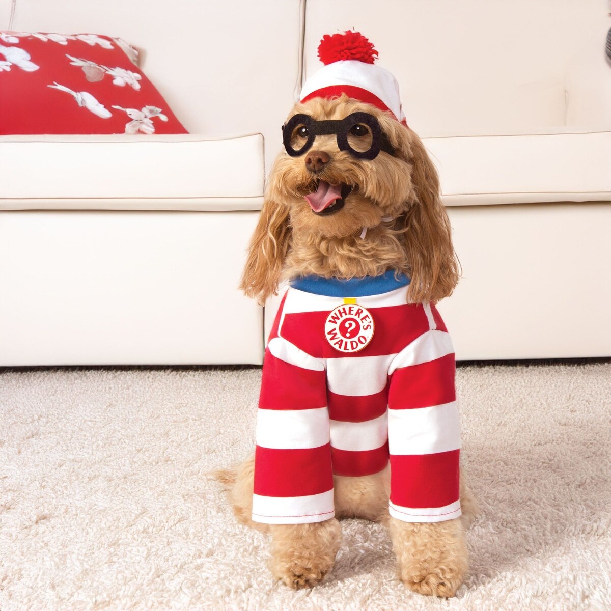 Perfect fit for my fella.... I never knew Waldo had a dog, and after reading about Woof's shy personality, and that he hid because he was scared - this was a no brainer for 2025. Shirt is well made, glasses are simply felt so handle with care getting on/off your furbaby.