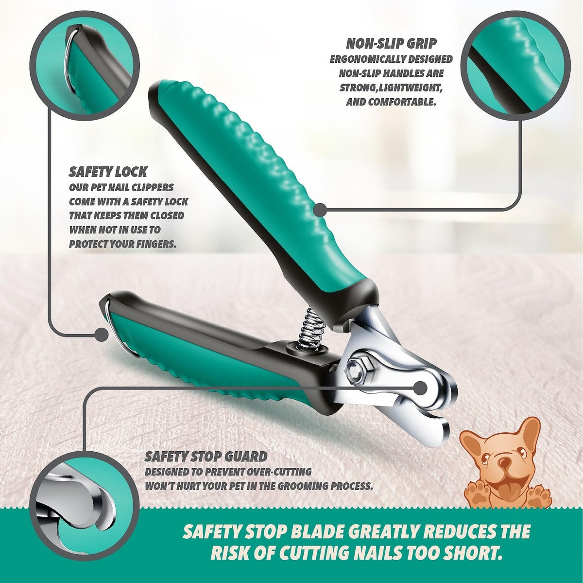 - The safety stop on the clippers helps prevent cutting nails too short.