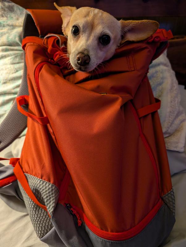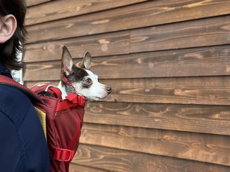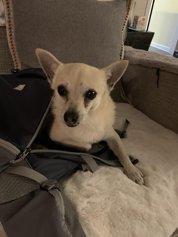Buddy is a blind little old man who would crawl inside my skin if he could but he has a hard time keeping up with my other dogs on walks. This backpack is perfect for him. I love the built in harness to keep him safe and strapped in and the straps to go across my chest and waist for comfort. We’ll be using this on a lot of hikes!!