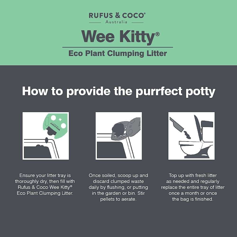 If your furry friend is hesitant to change litter types, simply sprinkle some of the existing litter over the top of Rufus & Coco Wee Kitty Eco Plant Clumping Litter.