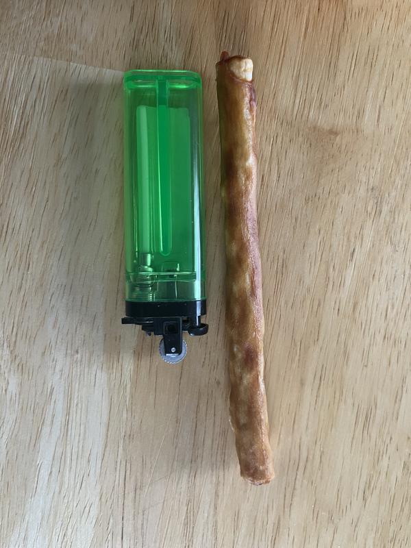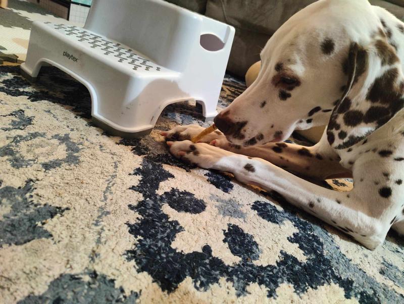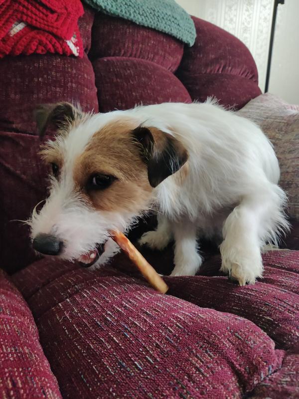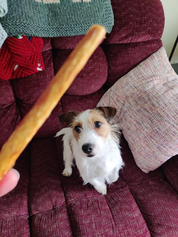 When the package arrived my dogs knew something good was about to come their way. The sticks are crunchy and apparently incredible flavourful according to them. One of my dogs (not pictured) devoured hers so quickly I was unable to get a pic of her enjoying it. However my 2nd dog was interested in investigating it before he utterly destroyed it!! I'd never heard of this brand prior to this but I'm pleasantly surprised with the joy that came when my dogs got their crunchy treats. Id definitely consider purchasing these or other similar products from the company in nthe future.