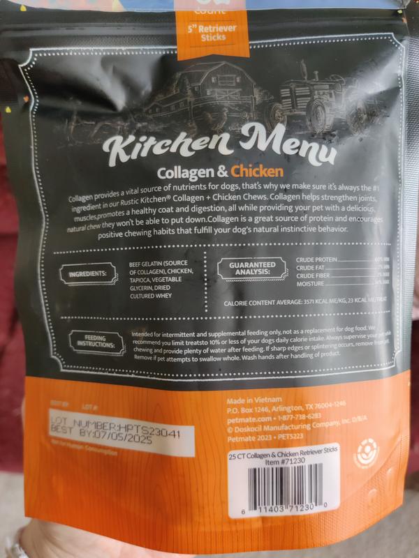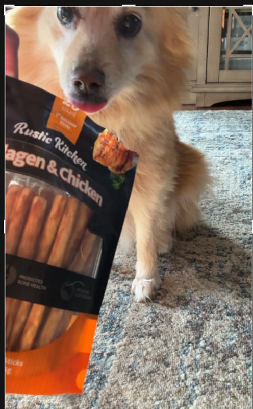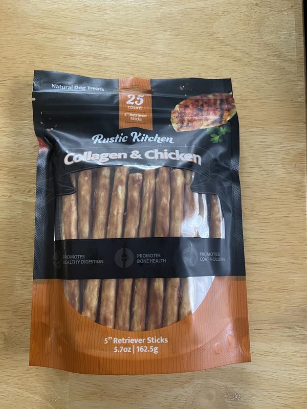 First and foremost, the ingredients list is impressive. Made with high-quality proteins and wholesome grains, Rustic Kitchen Collagen Retriever Sticks provide a nutritious snack that I feel good about giving to my furry friend. Knowing that they contain no artificial colors or preservatives gives me peace of mind, especially since my dog has a sensitive stomach. But what truly sets Rustic Kitchen Collagen Retriever Sticks apart is their irresistible flavor. My dog goes wild for them every time I bring out the bag. Whether used as a reward during training sessions or simply as a daily treat, these sticks never fail to elicit excitement from my pup. Another aspect I appreciate is the convenient packaging. The resealable bag ensures that the treats stay fresh, which is particularly handy for busy pet owners like myself. Overall, I can't recommend Rustic Kitchen Collagen Retriever Sticks enough. They're a win-win: delicious for my dog and beneficial for his health. If you're searching for a rewarding treat that both you and your furry companion will love, look no further than Rustic Kitchen Collagen Retriever Sticks.