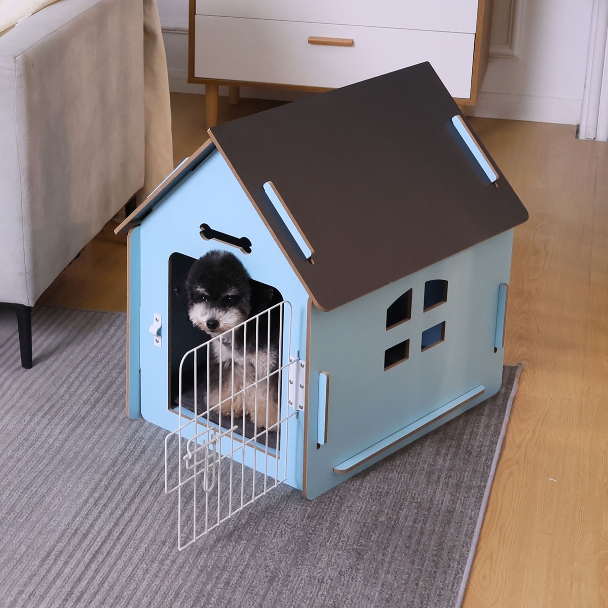 RYPetmia Indoor Wooden Dog & Cat House with Bed, Blue, Small