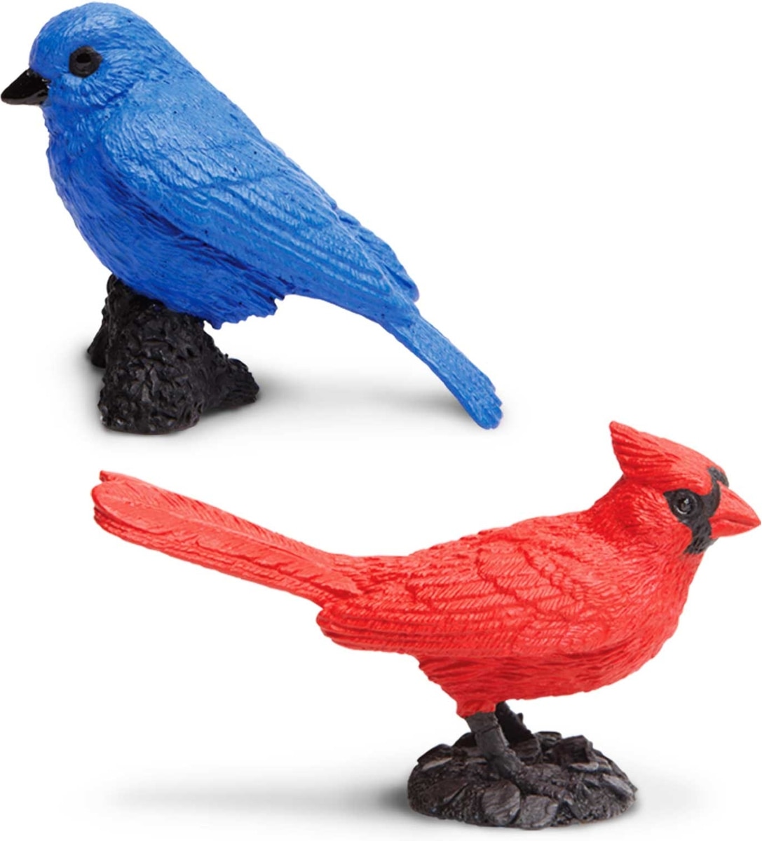 The backyard birds TOOB has a slight variety in sizes. Most of the birds range from 1.25 to 2.5 inches tall, and similar lengths. For example, the blue jay is 2.5 inches tall and about 1.25 inches long. The Cardinal is 1.5 inches tall and 2 inches long.