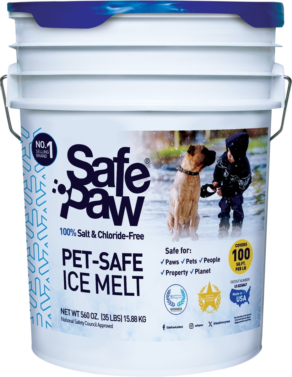 Safe Paw gives you peace of mind when using it around pets and your home. Made from safe proprietary compounds that do not contain harmful chemicals or salts, it won’t cause temperature swings when it makes contact with ice or snow. Salt and chloride-based ice melters cause the temperature to quickly rise, which can burn paws on contact. Those other ice melts can also be toxic if ingested—a common issue when pets lick their wounds.