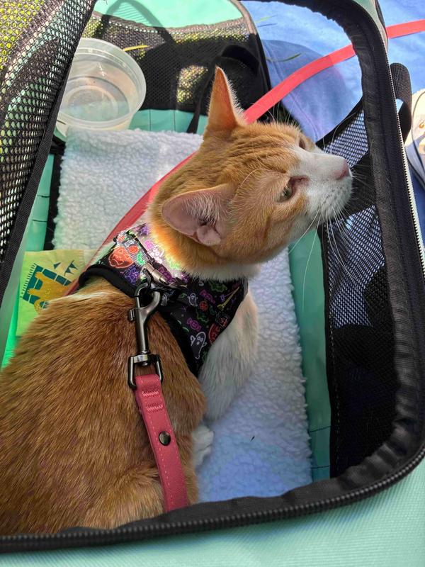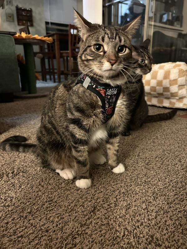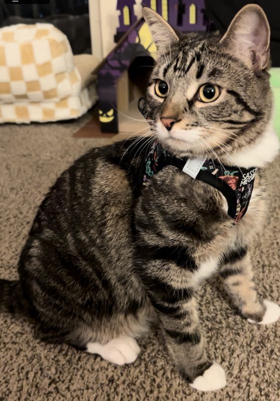 The harness is really cute, with lots of Halloween themed designs. Unfortunately JoeBob is an escape artist so I can't take him outside using this harness. It is very well made and would probably be fine for less strenuously rebellious cats. He wears ir inside and looks very handsome in it.