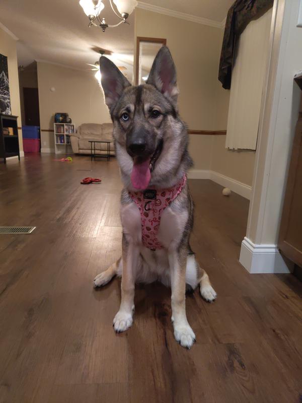 This harness is perfect! It’s exactly as pictured and love that it adjusts to a pretty big size. I just wish they had the matching collar in stock at time of purchase. (My dog would not cooperate with a photo sorry)