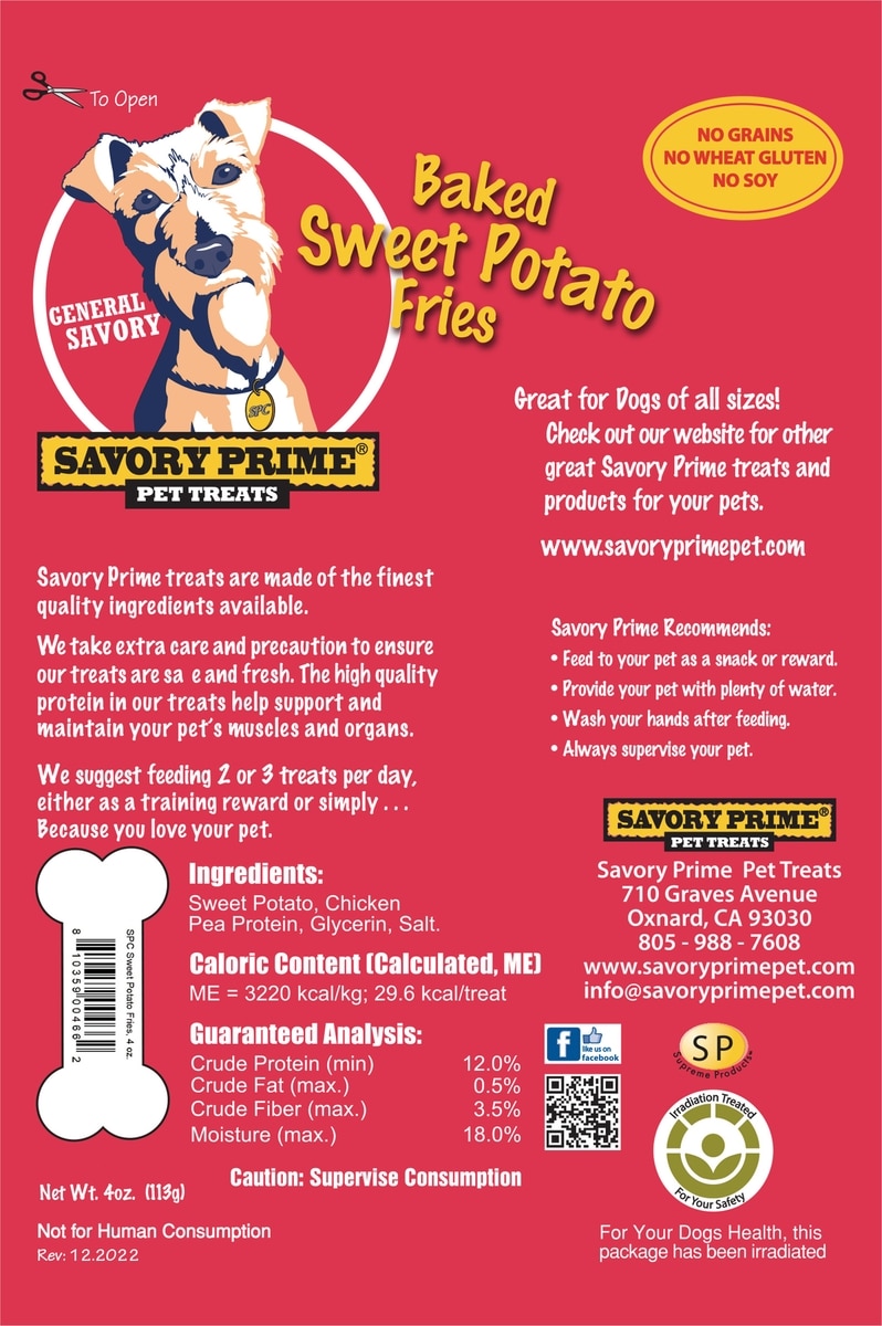 Savory Prime Sweet Potato Fries Soft & Chewy Dog Treats are made in Thailand.