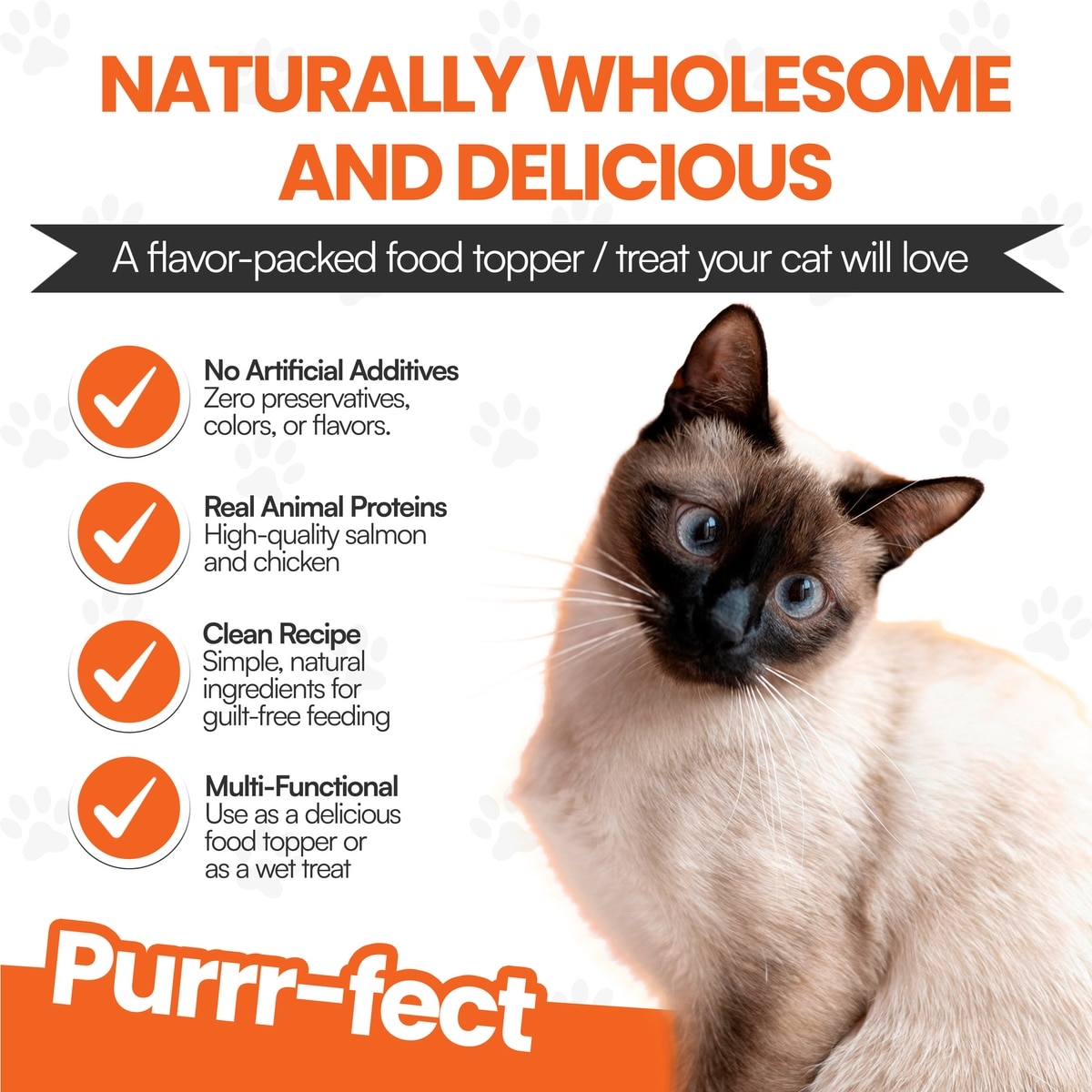 Yummy treat for ALL the kitties! Wow! The pouch had a lot more product than I was expecting, which was great as it was enough to share with multiple kitties at once. Some of my kitties are picky eaters, a few prefer wet food, others won’t touch it…but everyone ate this! I liked the added vitamins and minerals while being grain free to avoid extra fillers. The food comes out like a soup, which was a big plus for two of my older kitties with some teeth sensitivity. Would definitely recommend and order again!