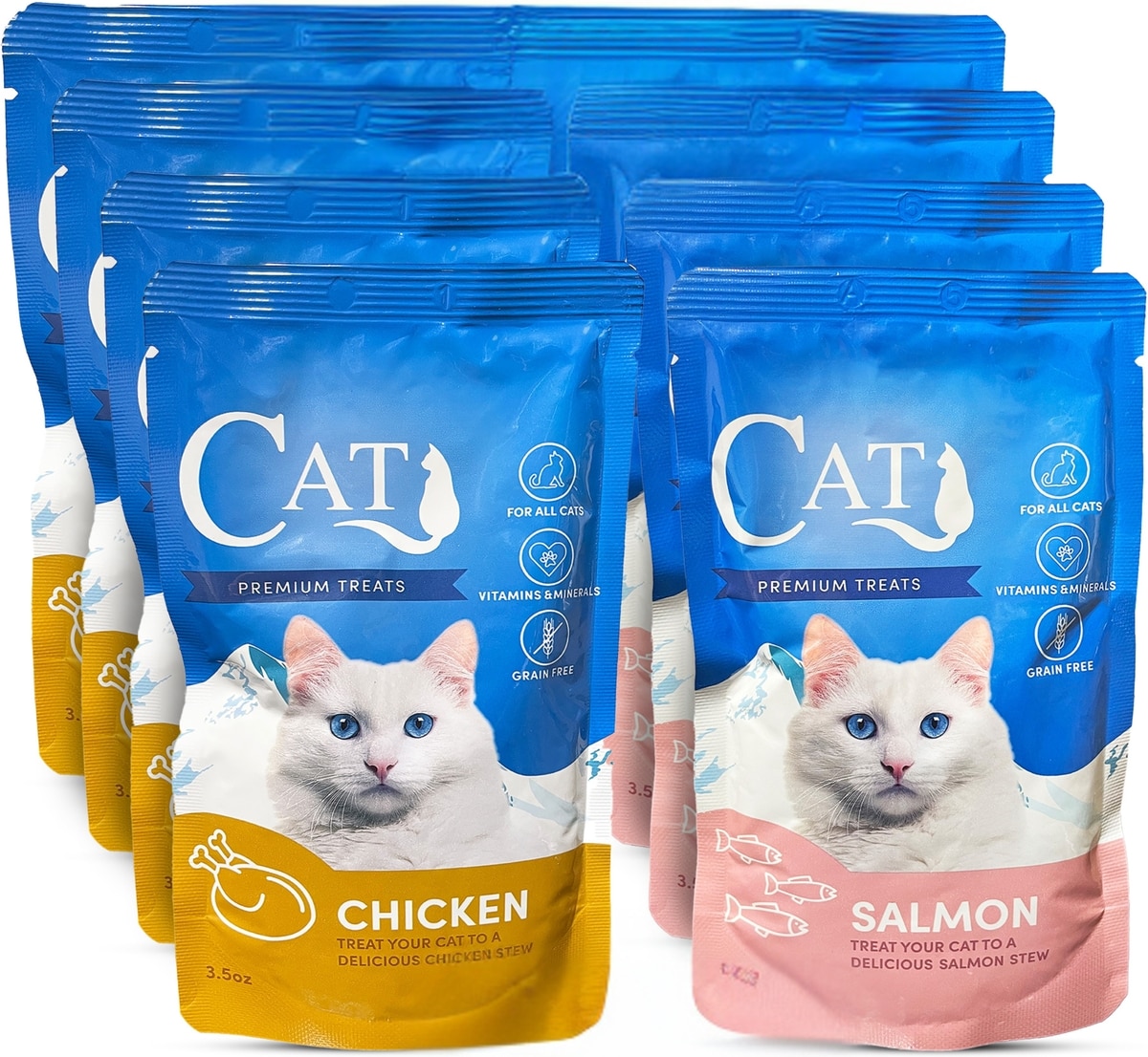 Scoochie Pet Mixed Variety Pack Premium Gravy Salmon & Chicken Stew Wet Cat Food Topping, 3.5-oz pouch, case of 8