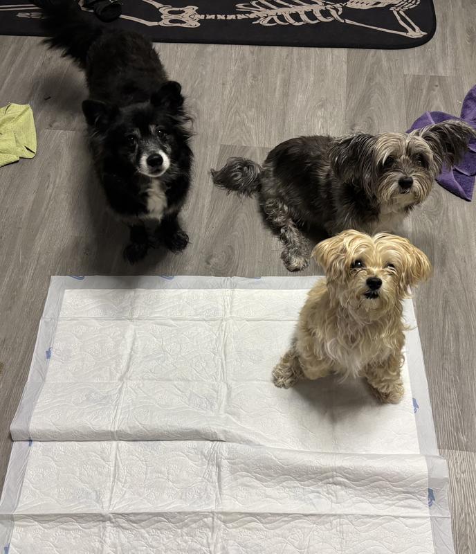 I have three dogs: Sadie (15lb, blonde), Oliver (18lb, black), and Sheila (22lb, grey). None of my dogs regularly use pee pads, but I do use them on occasion when