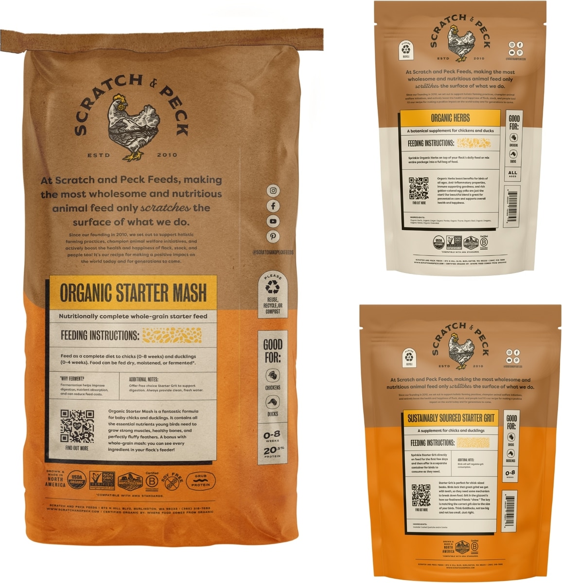 Bundle: Bundle: Scratch and Peck Feeds Chicken & Duck Starter Organic Starter Mash, 25-lb bag + Organic Herbs, 10-oz pouch + Starter Grit, 7-lb pouch
