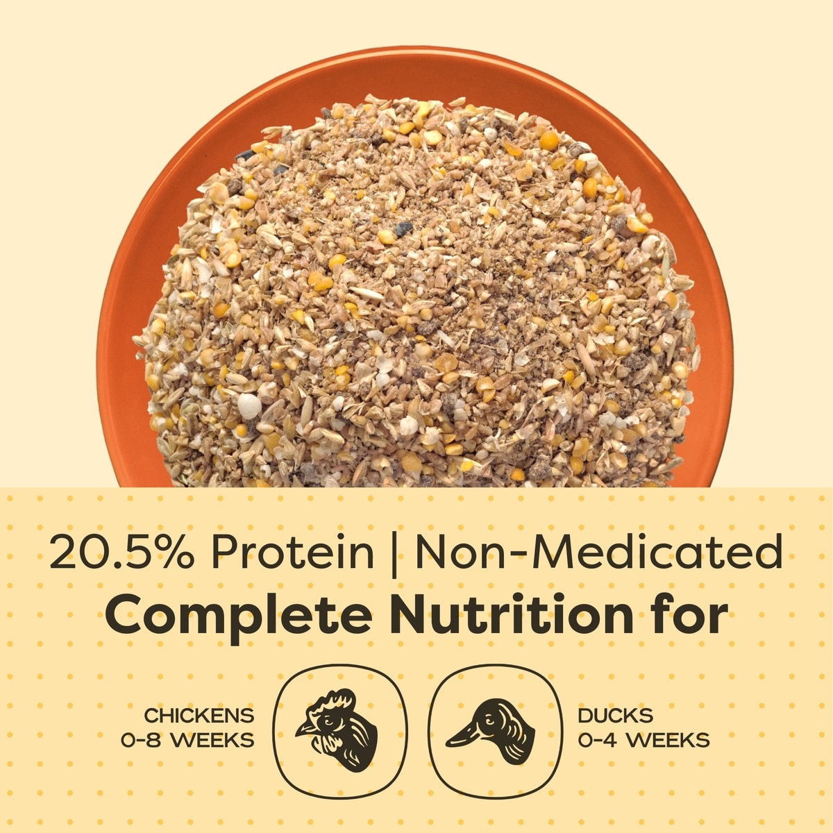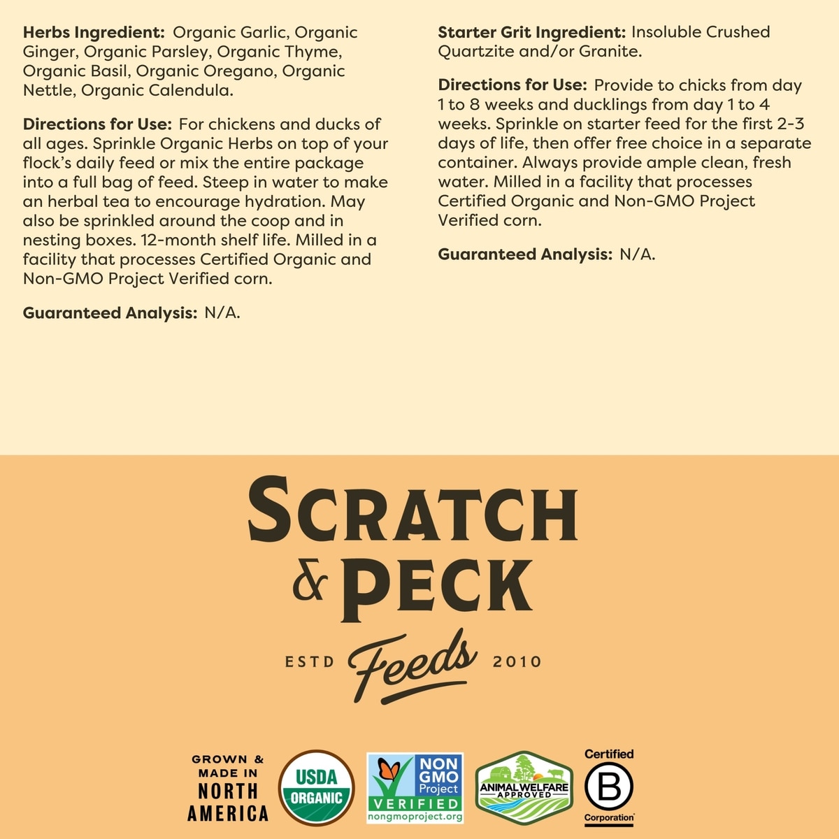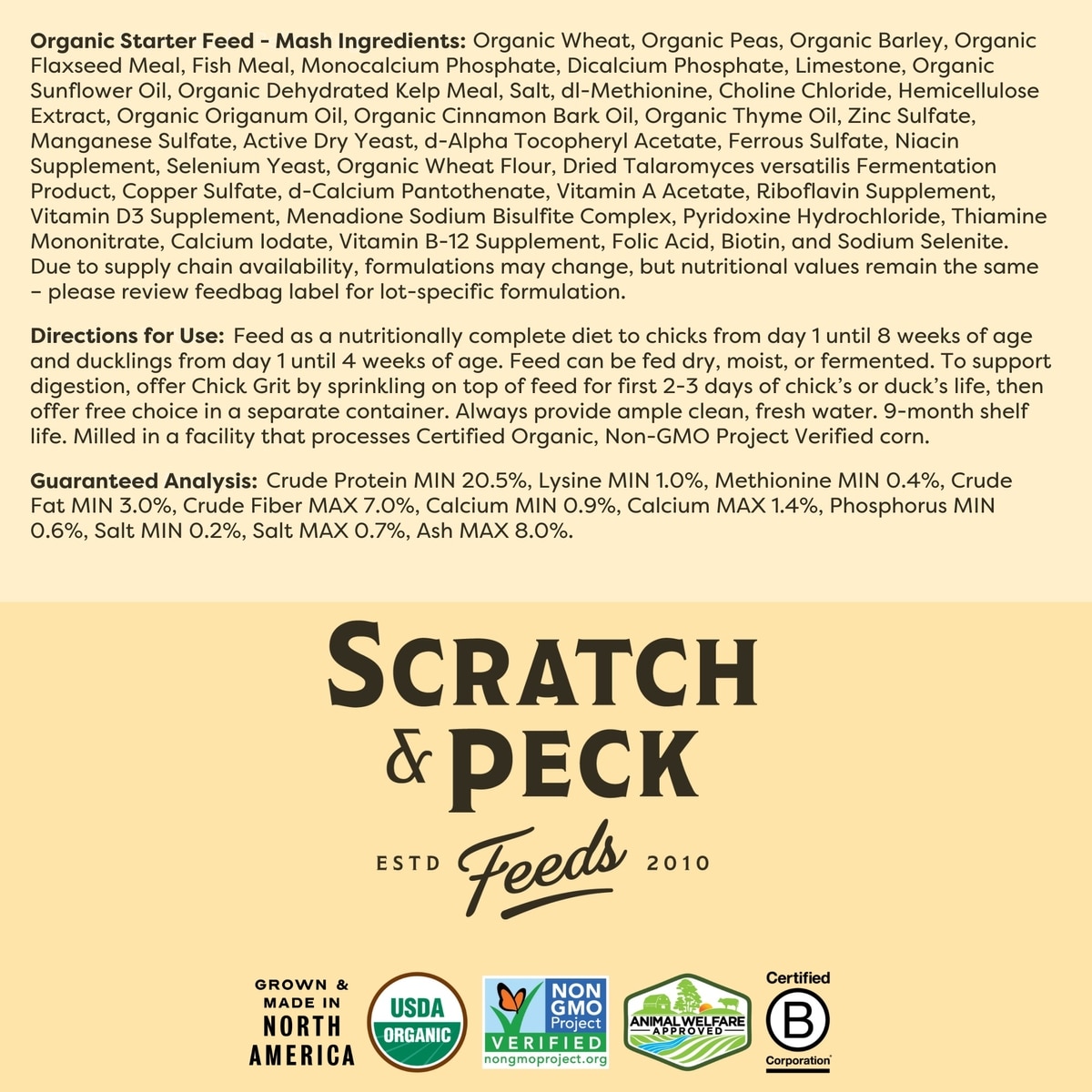 Scratch and Peck Feeds Naturally Free Organic Starter Chicken & Duck Feed, 25-lb bag—Give your growing chicks and ducklings the nutrition and taste they need to thrive with the Scratch and Peck Naturally Free Organic Starter Chicken Food. Formulated with organic, raw whole grains like wheat and barley, plus nutrient-rich meals like sesame, flax and kelp, it’s a complete and balanced feed for starting poultry chicks and ducklings. Naturally free of soy, corn or fillers, it packs more nutrition in every peck—like omegas, vitamins, minerals, probiotics and essential amino acids. Plus, it’s sourced and made in the USA with never any GMO foods.