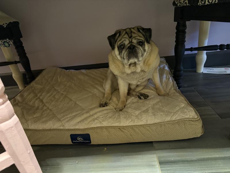 Exactly what we needed! No frills, just support, orthopedic egg crate foam, soft and supportive but breathable so my boy doesn’t overheat. Nice, clean mat. I ordered a medium and it turned out to be a little bigger than I anticipated, but that’s on me. Serta is still excellent. We have a serta bolster dog bed from ten years ago we bought at Sam’s club that has been washed a lot and is still going strong. This is a good brand of dog bed.