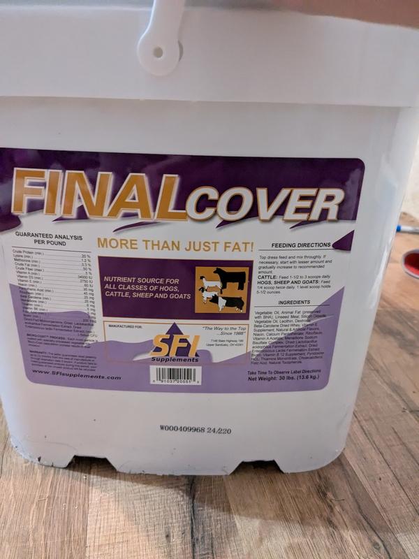 SFI Final Cover Animal Supplement will be used closer to our county fair time in June where we will show market and bred and fed hogs, a market heifer, a breeding heifer and 2 steer calves. Looking forward to achieving thick show hair on our cattle with this supplement.