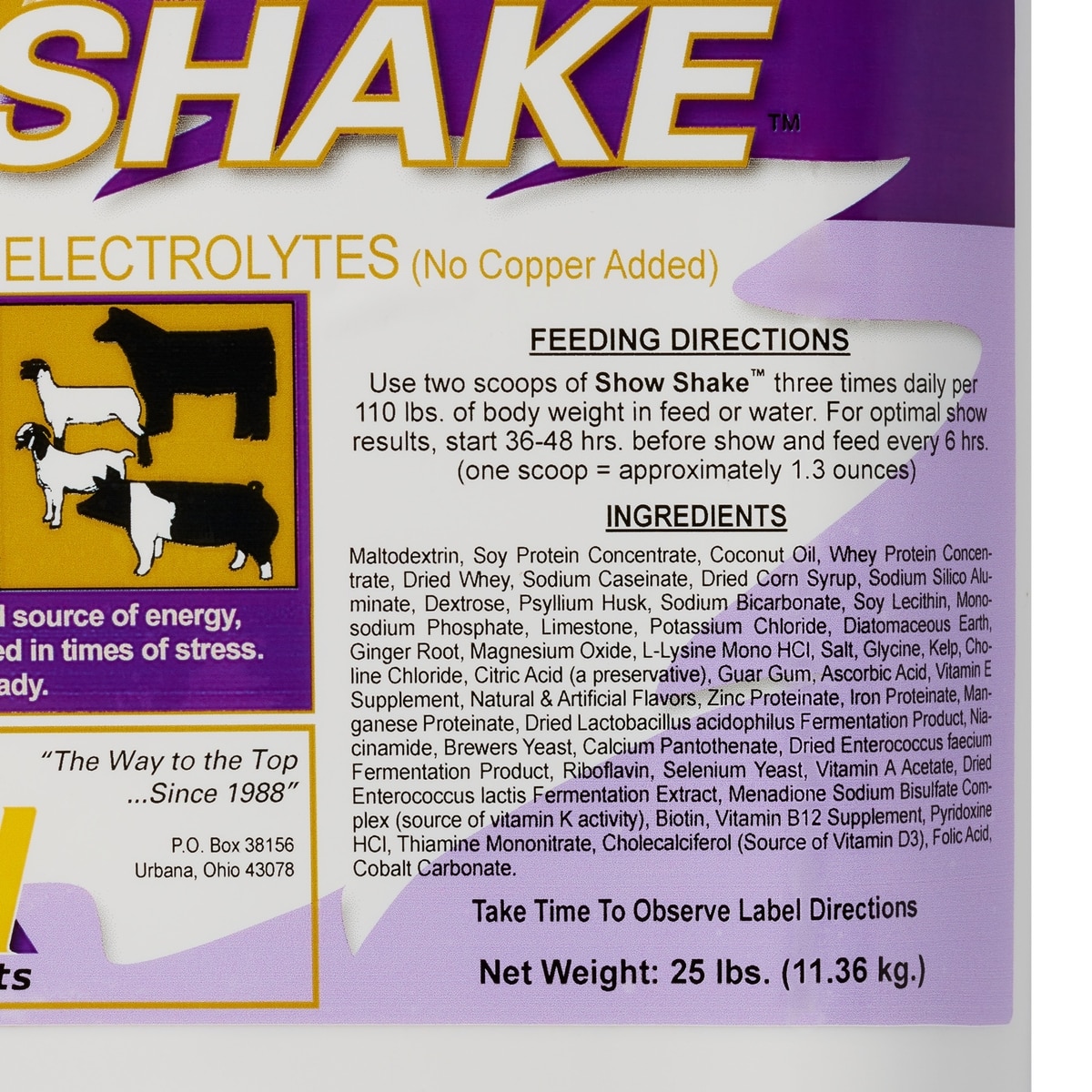 We used the Show Shake with our goats, donkeys and cows. All but one cow (who is really picky) seemed to enjoy the taste. From the label ingredients on the bag, this product seems to have all the nutrients to help the animals look and feel good for shows. We did not have a good way to determine positive results with the product, but we certainly did not see anything negative.