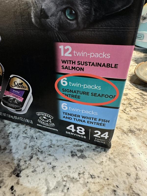 Ordered this because it’s devised as a 24-twin pack of specifically SIGNATURE SEAFOOD ENTREE, which is all my cat will eat. But it’s just the stupid variety pack that you get at Kroger, so I’m stuck with 18 twin-packs of food she won’t eat. Waste of money. Chewy should be ashamed of themselves selling this as all one type.