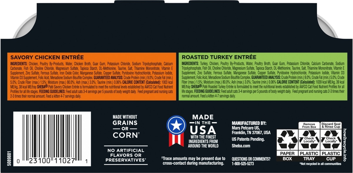 - Sheba Perfect Portions Grain-Free Savory Chicken, Roasted Turkey & Tender Beef Pate Variety Pack Adult Wet Cat Food Trays, 2.6-oz tray, case of 24$22.38 Chewy Price$25.98 List Price$21.26 Autoship PricePromo, New Customers Only: Spend $49+, Get $20 eGift Card