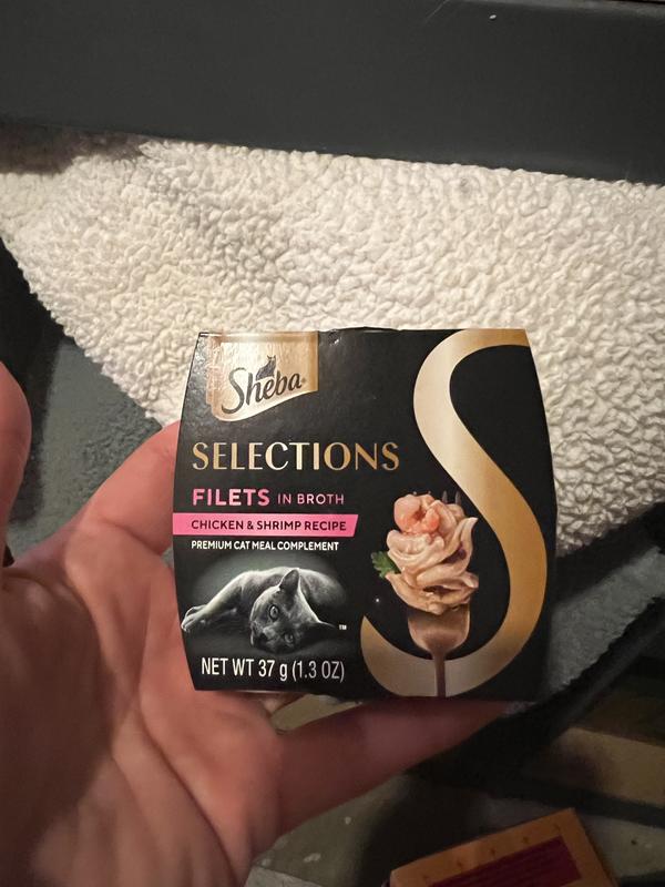 - DealSheba Selections Filets in Broth Chicken with Tuna & Chicken with Shrimp Variety Pack Grain-Free Cat Meal Complement, 1.3-oz tray, case of 24$24.74 Chewy Price$32.98 List Price$23.50 Autoship PricePromo, New Customers Only: Spend $49+, Get $20 eGift Card