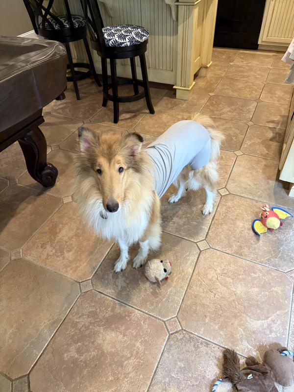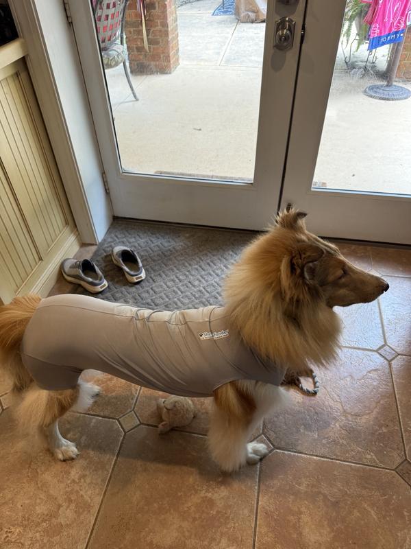 The Recovery Onsie covers the underside of the dog from the neck to the base of the tail, including the inside of the hind leg.