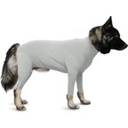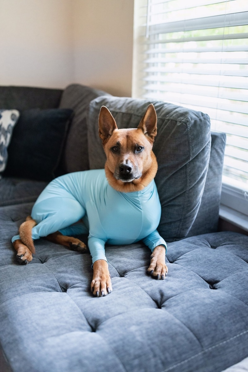 This body suite does not zip all the way back to the base of the dogs tail. We recommend the original. Sizing is based on your pet's weight. For the complete sizing chart, click the “Size” tab, next to the “Instructions” tab, just under the product photos. Click the "Size" tab, next to the "Highlights" tab, towards the top bar above the product image when viewed on the app.