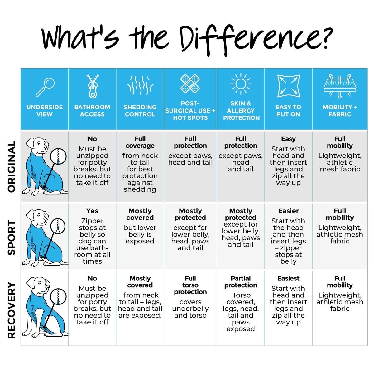 This body suite does not zip all the way back to the base of the dogs tail. We recommend the original. Sizing is based on your pet's weight. For the complete sizing chart, click the “Size” tab, next to the “Instructions” tab, just under the product photos. Click the "Size" tab, next to the "Highlights" tab, towards the top bar above the product image when viewed on the app.