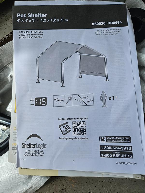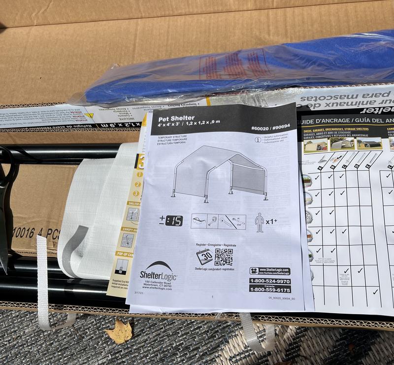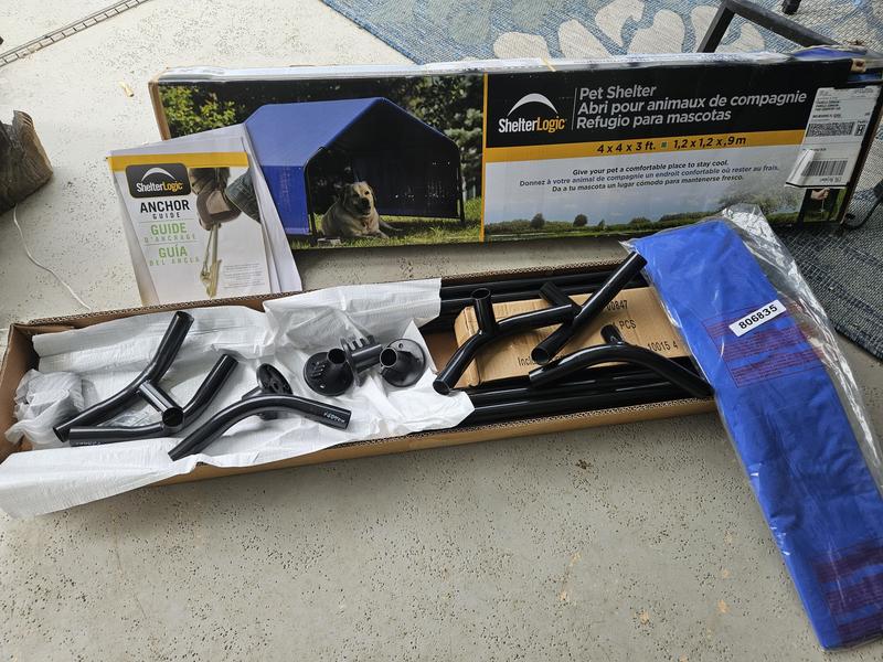 This product has been newly assembled and is not being reviewed at this time for long lasting durability or under severe weather conditions. The instructions state one person is needed for assembly with minimal tools and a +/- 15 minute assembly time is estimated. The frame and canvas took 30 minutes to assemble with another 20 minutes added to fuss with the brackets and bolts and adjustments required. The product arrived with clear visual instructions, however many of the parts are not clearly labeled for assembly (see photo) which definitelyadds to the assembly time. Also, the anchors were provided, but not utilized at this time, so additional time would need to be allotted if these are used. Assembly tip: Be sure to insert the poles fully into one another before moving on to the next step in order to keep everything fitting properly, including getting the velcro to attach around the poles. Fully assembled, the shelter remains fairly lightweight and easy to move around, and would definitely require being secured to the ground if being left out in any windy or stormy weather. The instructions make note that it is not meant as a snow shelter. The dogs went right under it and look like they will enjoy a break from the sun!