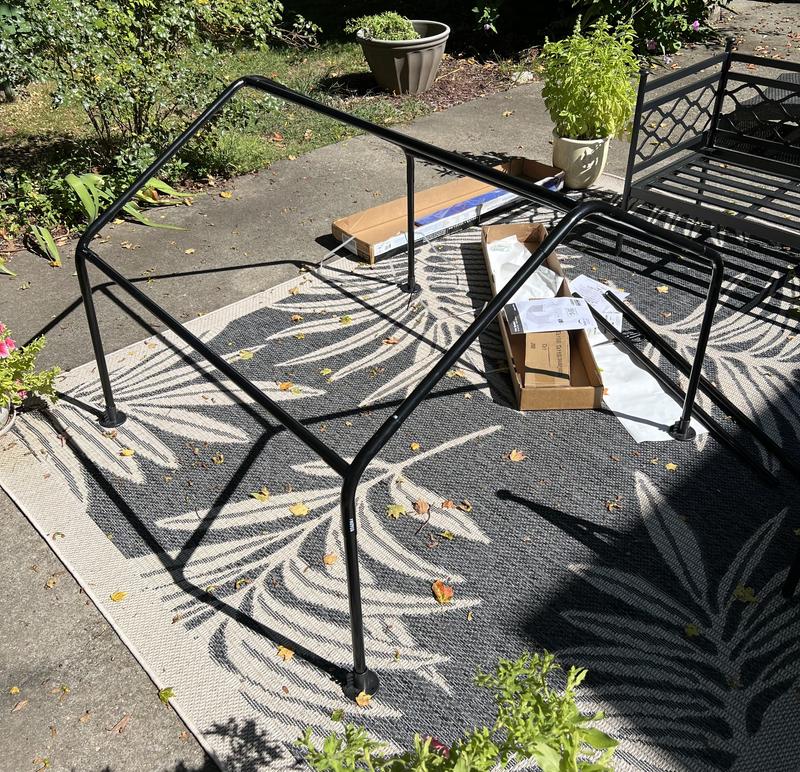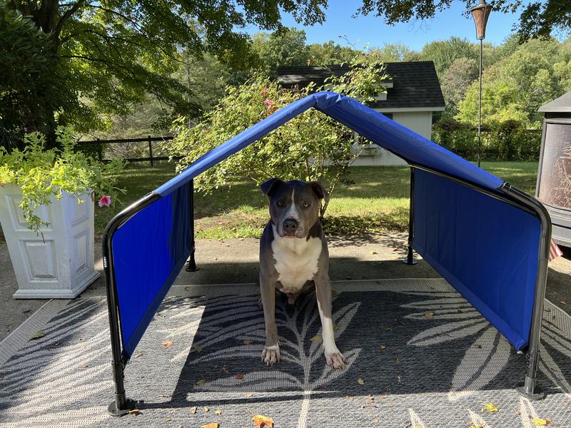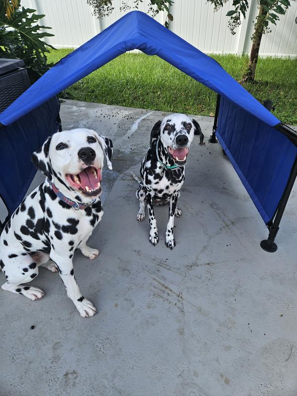 Great pet shade for my senior dog. Like the option of having the foot plates, which won’t damage deck and patio surfaces. Easy to assemble, just make sure all the metal pieces are COMPLETELY pushed into their connections. I used a rubber mallet to bang the connections tightly together. Otherwise, you will find that the canvas cover won’t fit. Also, had trouble reading the numbers printed on the metal pieces. Not a big deal, easy to figure out, but would have been easier if the manufacturer used stickers with the numbers vs. having imprinted on the metal.