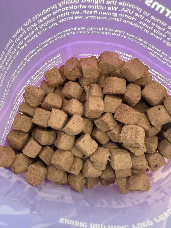 When I first got this, I didn’t realize it was dog food until I read the feeding instructions (especially being freeze dried); pleasantly surprised. They seem really excited lately for meal time as I just shake the bag and they come running. The product does not have a bad smell to it and it doesn’t leave a bad breath smell with them after they eat it. It is not greasy feeling but actually a nice dry morsel that is not flakey and it is perfect size for them for their food topper. Definitely beagle approved (and human too).
