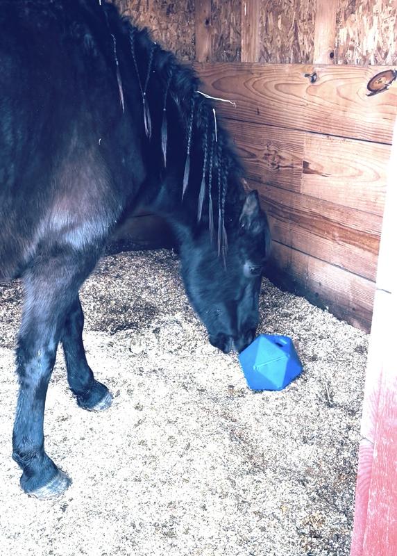 This ball feeder for horses is designed to dispense treats, pellets or grain as it is rolled around.