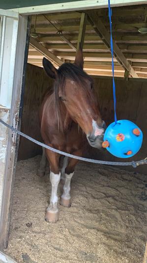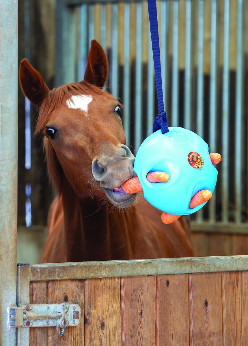 I saw this and immediately added it to my cart. I have a draft x who is my Cookie Monster always looking for treats and constantly uses his muzzle to play with my hair pull my shirt and beg for more treats! Because he is so curious I thought it would be a good toy to use while grooming him and as a reward after a ride. Immediately when I hung up the ball he was slinging it around and grabbing carrots. You don’t have to inflate it very much and it will still hold the carrots firm enough to make the toy a puzzle for your horse. Only complaint is description says it comes with an adaptor, the adaptor is for a bike pump you need your own pump and hanging materials. I just used an old dog leash to hang as my horse is only using this under my supervision and will be taken in and out of his stall.