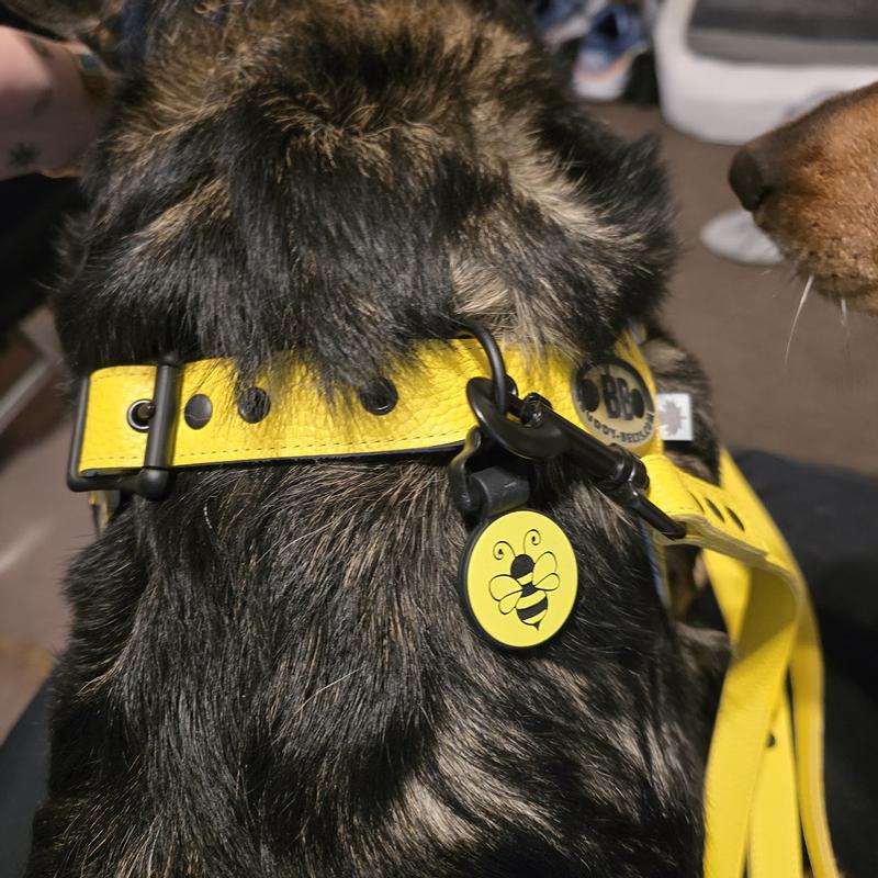 Beautiful silent dog tag that includes important info but doesn't jingle! Love the yellow bee imprint to make it attractive, not just functional. Hook makes it easy