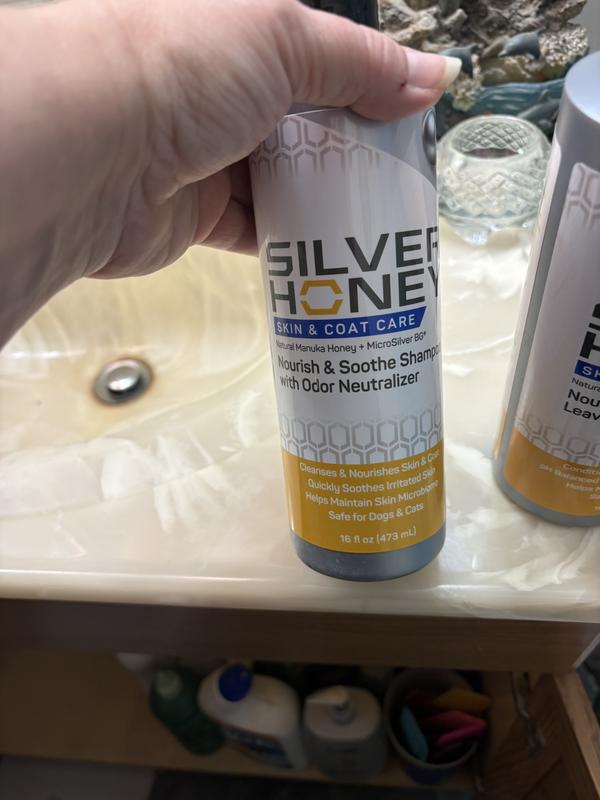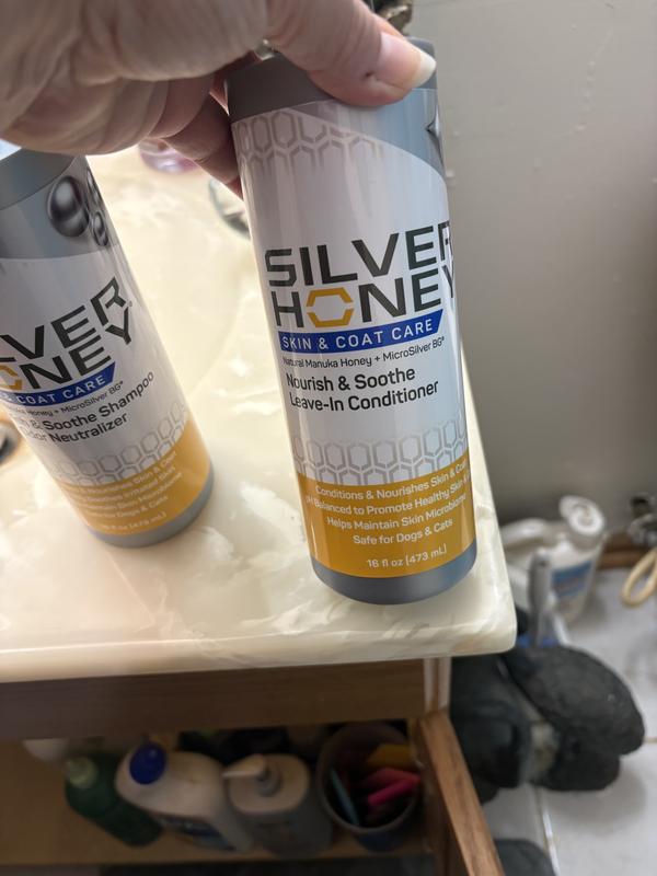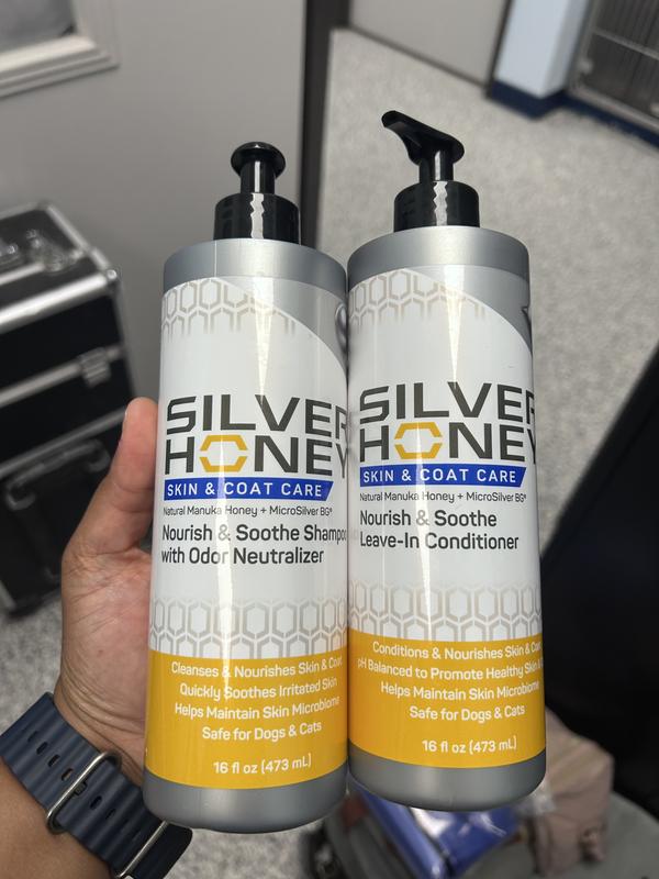 For Skin That Glows and Coats That Shine Silver Honey’s new Nourish & Soothe Shampoo and Leave-In Conditioner provide gentle, natural skin and coat care for dogs and cats. Made with Manuka Honey and MicroSilver BG, they calm irritation, hydrate dry skin, and neutralize odors while restoring shine. Safe, pH-balanced, and free from sulfates and parabens—ideal for sensitive or itchy pets.