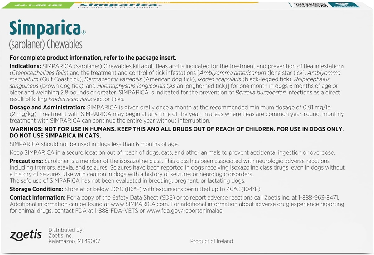 Simparica is for use only in dogs 6 months of age and older. Simparica, which contains sarolaner, a member of the isoxazoline class, may cause neurologic signs such as tremors, unsteadiness, and/or seizures in dogs with or without a history of neurologic disorders. Simparica has not been evaluated in pregnant, breeding, or lactating dogs. The most common adverse reactions in clinical trials were vomiting and diarrhea. See full Prescribing Information at SimparicaPI.com.