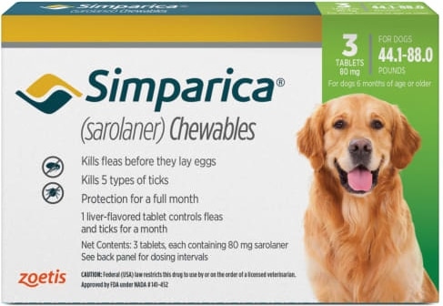 Simparica Chewable Tablet for Dogs, 44.1-88 lbs, (Green Box), 3 Chewable Tablets (3-mos. supply)