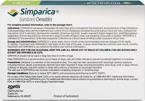 Simparica is tasty pork liver-flavored, veterinarian-recommended monthly chew that protects your dog from fleas and ticks for a full 35 days.[1] It works fast and starts to kill fleas in 3 hours and ticks in 8 hours.[2] Simparica is approved for dogs 6+ months of age, weighing 2.8 lbs or more.