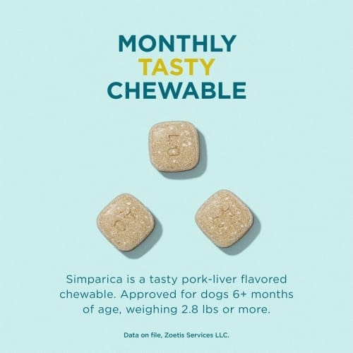 Simparica is tasty pork liver-flavored, veterinarian-recommended monthly chew that protects your dog from fleas and ticks for a full 35 days.[1] It works fast and starts to kill fleas in 3 hours and ticks in 8 hours.[2] Simparica is approved for dogs 6+ months of age, weighing 2.8 lbs or more.